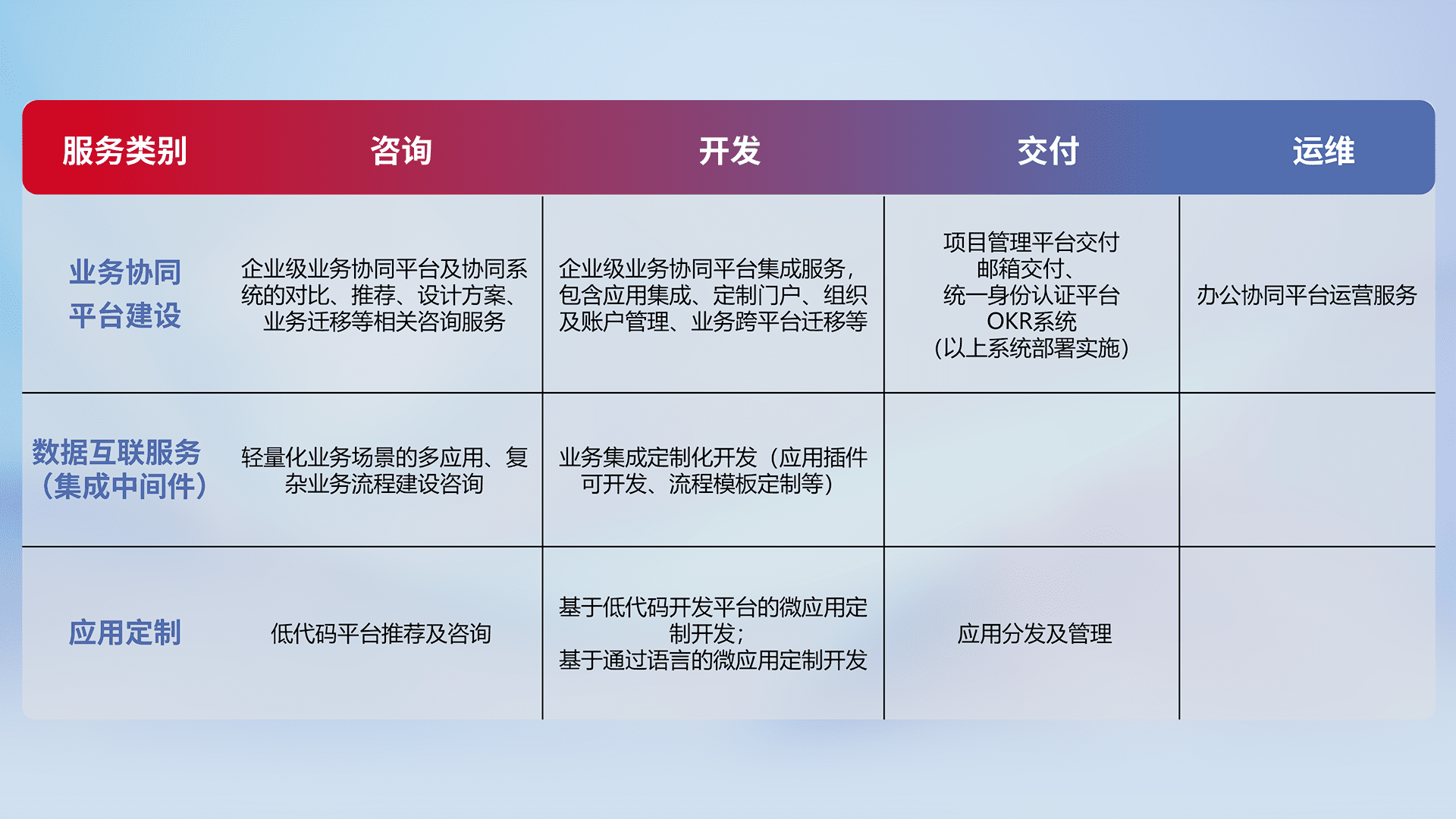 针对钉钉、、、、企微、、、IDaas等平台级产品提供产品的规划、、、、方案、、、、交付、、定制化开发等服务,,,,实现如统一协同办公、、、、智能客户服务、、混合会议管理、、、智能数据查询、、、等业务场景,,,实现数字化转型。。
